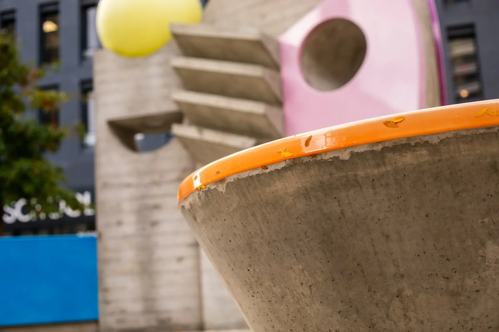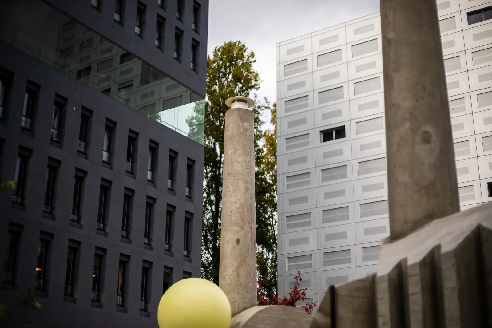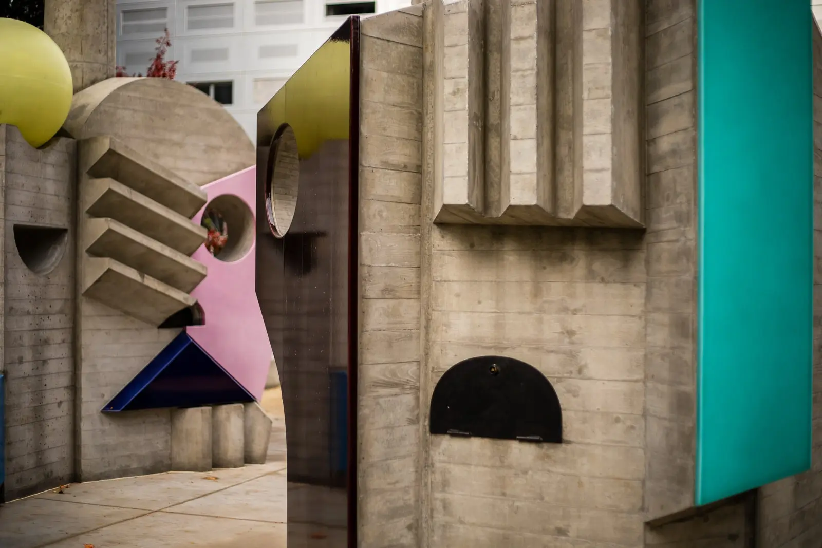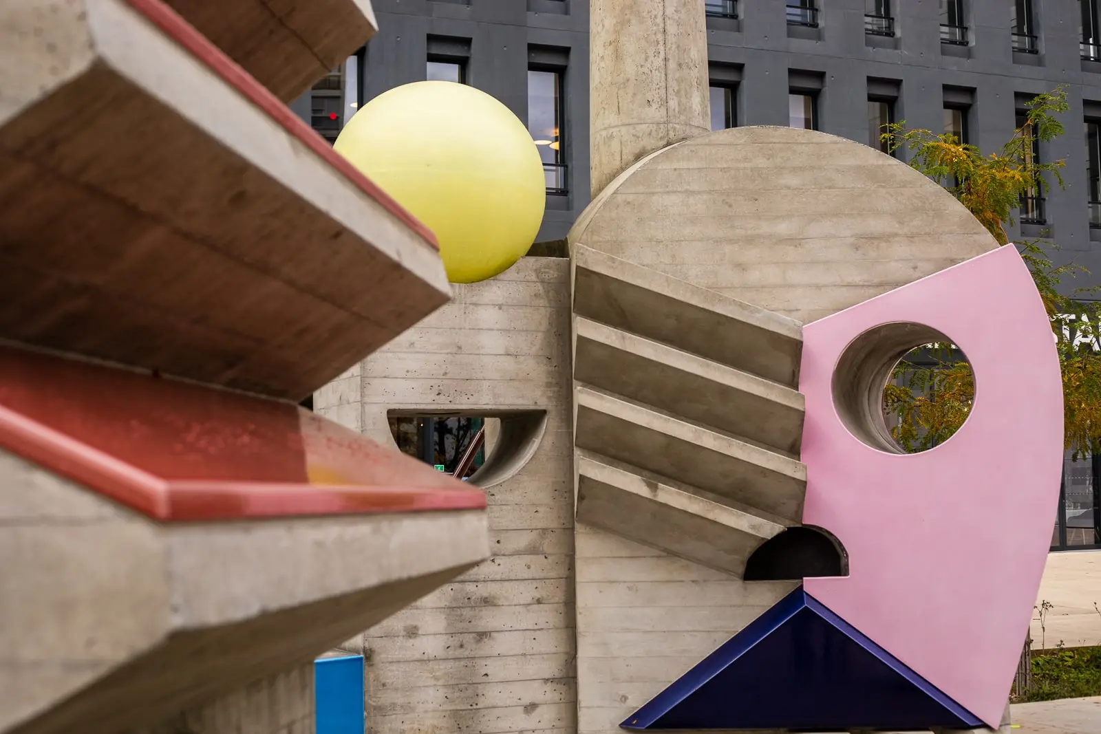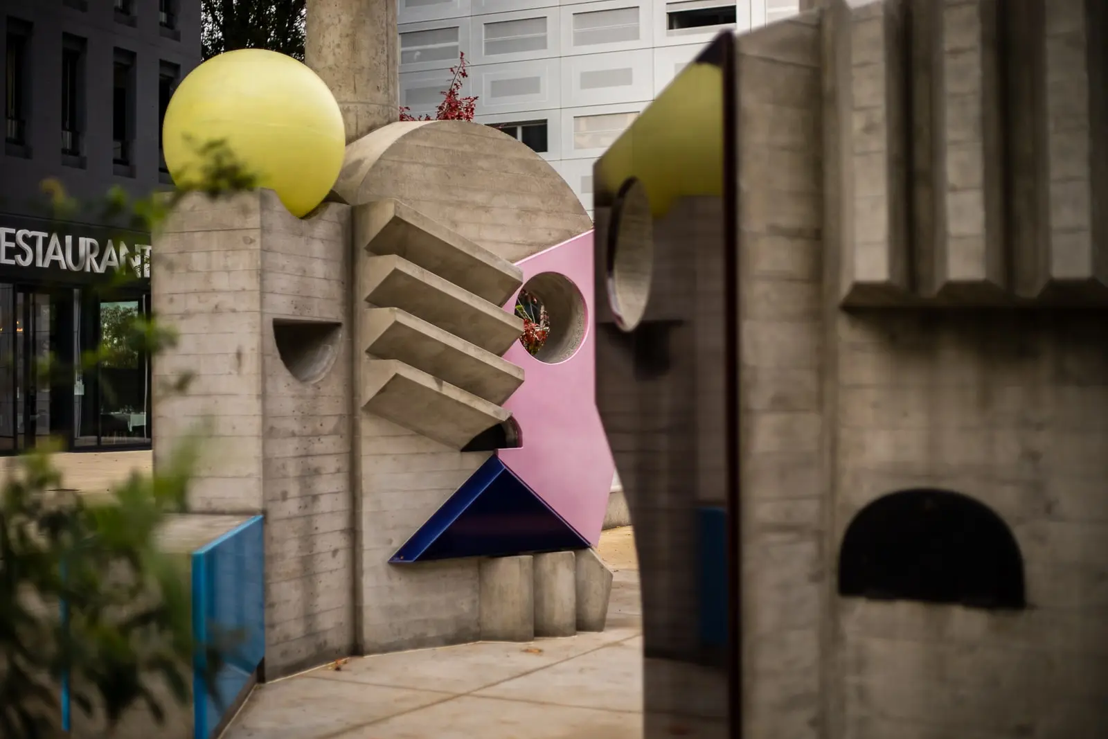 Oeuvre d'art imaginée par MARTINE FEIPEL ET JEAN BECHAMEIL. Le défi a été de la construire à l'identique d'une maquette, redessinée en 3 dimensions en prenant en compte les contraintes à la fois esthétiques et structurelles. Moulées par des coffrages bois sur mesure effet coffrage brut inspiré de Le Corbusier, les demi-coquilles en béton armé ont été assemblées sur site pour permettre l'intégration de fours à bois traditionnels habillés de leurs imposantes cheminées. Les ouvrages ont ensuite été décorés de pierres de lave émaillées amenant la touche de couleur.